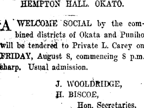 HEMPTON HALL. OKATO. SOCIAL by the combined districts of Okata and Puniho frill be tendered to Private L. Carey on FRIDAY, August 8, commencing S p.m. feharp. Usual admission. J. WOOLDItIDGE, P. BISCOE, . Hon. Secretaries.