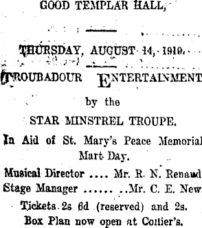 GOOD TEMPLAR HALL; SBCES3DAY, AUGUST U, • 1919, - • gmOUBADOUR J£NTERTAIXMENT STAR MINSTREL TROUPE. Ja Aid of St. Mary's Peace Memorial Mart Day. Musical Director .... Mr. S. N. Renaad Stage Manager ..Mr. C. E. New. Tickets,2s 6d (reserved) and 2s. Box Plan now open at Collier's.