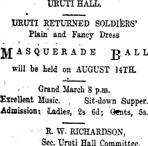 UKUTIHALL. imUTI RETURNED SOLDIERS' Plain and Fancy Dress JfASQUEEADE J}. AL L will be held on AUGUST 14TH. Grand March 8 p.m. Excellent llusic. , Sit-down Supper. Admission:. Ladies, 2s 6d; Qents, ss. W-RICHARDSON, Sec. Uruti Hall Committee.