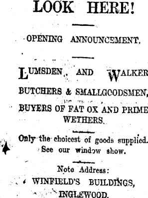 LOOK HERE! -OPENING ANNOUNCEMENT. AND TOALKER BUTCHERS & SMALLGOODSMEN, JIUYERS OP FAT OX AND PRIME WETHERS,. Oaljr ther choicest of goods supplied. •See our window show. Note Address: :,'* WJNFIELD'S BUILDINGS, '" ■■':■'- v INGtEWOOD.