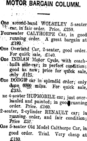 MOTOR. BARGAIN COLUMN. One Wc%.hand WOLSELEY 5-seater 1 car, itf fair order. Price, £250 Fourseater CAIrfHORPE Car, in good ; - T S^tS '...***. A great bargain at £180.; ■ * One Overland Car, 2-seater, good order. For quiclt sale, £l4O One INDL4K MoJor.Cjcte, **ith coachbjiilt asfte-car; in perfect conVlitkm; good fe new; price for quick sale, drily £125. One BODGftoaf in splendid oYdei*- only <toj»fc 6QPJ} miles. For quick sale, £335. , . l nc 4-BeaterHUPMOBILE car; just ovororder. Price. £l6O. 2-seater, 2-cylinder RENAULT car; in running, order, and fair condition; Price £55.' One 5-Seater Old Model Calthorpe Car, in good order. Trial. Very cheap at £l3O.