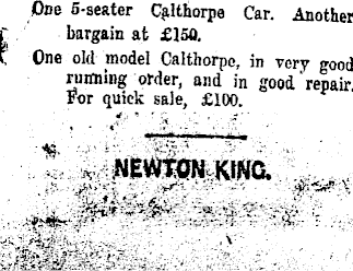 One 5-seater Calthorpe Car. Another bargain at £l5O. One old model Calthorpo, in very good running order, and in good'repair. For quick sale, £IOO. * JIEWtmKING.