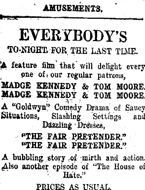 AMUSEMENTS. EVERYBODY'S TO-NIGHT, FOR. THE LAST TIME. 'A feature fito" that" will delight every pne of our regular patrons, MADGE KENNEDY & TOM MOORE. MADGE KENNEDY & TOM MOORE. A "Goldwyn'/ Comedy Drama of Saucy Situations, Slashing 'Settings and Dl&ling' Dresses, •'THE FAIR PRETENDER." "THE FAIR PRETENDER" A bubbling, .story ,o£ mirth and action. ,Also another episode of "The House of •■ Hate." PRICES AS USUAL.