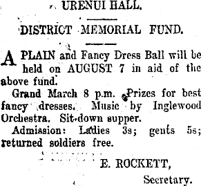URENUI HALL. DISTRICT MEMORIAL FUND. _A PLAIN and Fancy Dress Ball will be held on AUGUST 7 in aid of the above fund! Grand March 8 p.m. prizes for best fancy ;dresses. Music by Inglewood Orchestra. Sit-down supper. Admission: Latties 3s; gents ss; returned soldiers free. 1 -- '' E. EOCKETT, . Secretary.