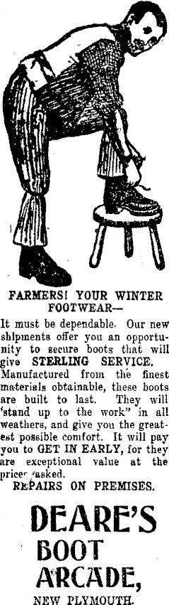 FARMERS! YOUR WINTER FOOTWEAR— It must be dependable. Our new shipments offer you an opportunity to secure boots that will give STERLING SERVICE. Manufactured from the finest materials obtainable, these boots are built to last. They will 'stand up to the work" in all weathers, and give you the greatest possible comfort. It will pay you to GET IN EARLY, for they are exceptional value at the prices /asked. REPAIRS ON PREMISES. DEARE'S BOOT ARCADE, NEW PLYMOUTH.