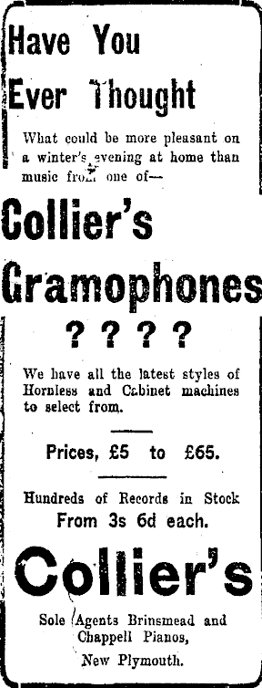 Have You |Ever Thought I What could be more pleasant on | l a winter's A evening at home than music froZf one of—- ?? ? ? We have all the latest styles of Hornless and Cabinet machines to select from,. Prices, £5 to £65. Hundreds of Records in Stock From 3s 6d each. Sole 'Agents Brinsmead and Chappell Pianos, New Plymouth.