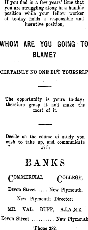 If you find in a few years' time that you are struggling along in a humble position while your fellow worker of to-day holds a responsible and lucrative position, WHOM ARE YOU GOING TO BLAME? CERTAINLY NO ONE BUT YOURSELF. The opportunity is yours to-day; therefore grasp it and make the most of it. Decide on the course of study you wish to take up, and communicate * with BANKS rjOMMERCIAL COLLEGE, Devon Street New Plymouth. New Plymouth Director: MR, VAL. DUFF, A.LA..N.Z. Devon Street New Plymouth