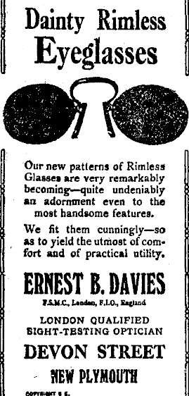 Dainty Rimless Eyeglasses Our new patterns of Rimless Glasses are very remarkably becoming l —quite undeniably an adornment even to the most handsome features. We fit them cunningly—so as to yield the utmost of comfort and of practical utility. ERNEST B. DAVIES IiMC Uodw, F. 1.0, E«tljod LONDON QUALIFIED EIQHT-TBSTING OPTICIAN DEVON STREET HEW PLYMOUTH