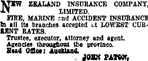 VnEW ZEALAND I.VSDEAKCE COMPANY, A* LIMITED. FIRE, MARINE end ACCIDENT INSURANCE b til Its branches accepted a LOWEST CURRENT BATES. Trustee, executor, attorney and agent. Agencies throughout the prorlnco. Head Offlot: AucUud. - JOHN PAWN,