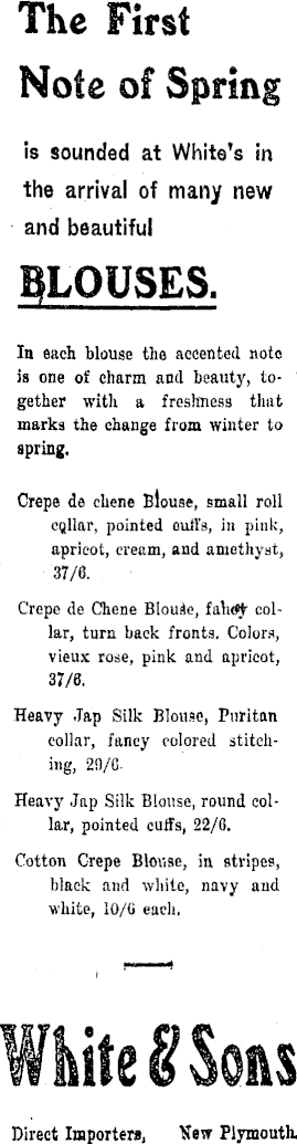 The First is sounded at White's in the arrival of many new and beautiful BLOUSES. In each blouse the accented noto is one of charm and beauty, together with a freshness that marks the change from winter to spring. Crepe de chene Blouse, small roll cellar, pointed Gull's, in pink, apricot, cream, and amethyst, 37/6. Crepe de Chene Blouie, fahdjy collar, turn back fronts. Colors, vieux rose, pink and apricot, 37/8. Heavy Jap Silk Blouse, Puritan collar, fancy colored stitching, 20/0. Heavy Jap Silk Blouse, round collar, pointed cuffs, 22/0. Cotton Crepe Blouse, in stripes, black and white, navy and white, 10/G each, Direct Importers, tfew Plymouth.