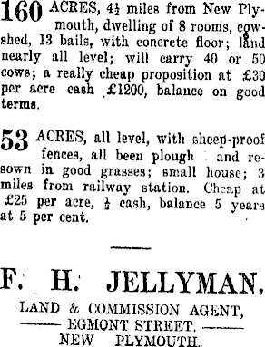 Jgo ACRES, 4} miles from New Plymouth, dwelling of 8 rooms, cowshed, 13 bails, with concrete floor; land nearly all level; will carry 40 or 50 cows; a really cheap proposition at £3O per acre cash ,£I2OO, balance on good terms. gg ACRES, all level, with sheep-proof fences, all been plough and resown in. good grasses; small house; 3 miles from railway station. Cheap at £25 per acre, J cash, balance 5 years at 5 per cent. F. H. JELLYMAN, LAND & COMMISSION AGENT, KGMONT STREET. NEW PLYMOUTH.