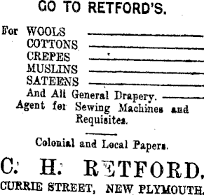 GO TO RETFORD'S. And AH General Drapery. Agent fei Sewing Machine* and Requisite*. Colonial and Local Papen, C. H. RETFORD, CUKME STREET, NEW PLYMOUTH.