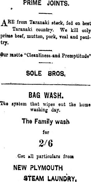 PRIME JOINTS. from Taranaki stock, fed on beat Taranaki country. We kill only prime beef, mutton, pork, Teal and poultry. our a»tte "Cleanliness -and Promptitude" SOLE BROS, BAG WASH. The system that wipes out the home washing day. The Family wash Get all particulars from NEW PLYMOUTH STEAM LAUNDRY,