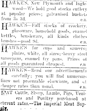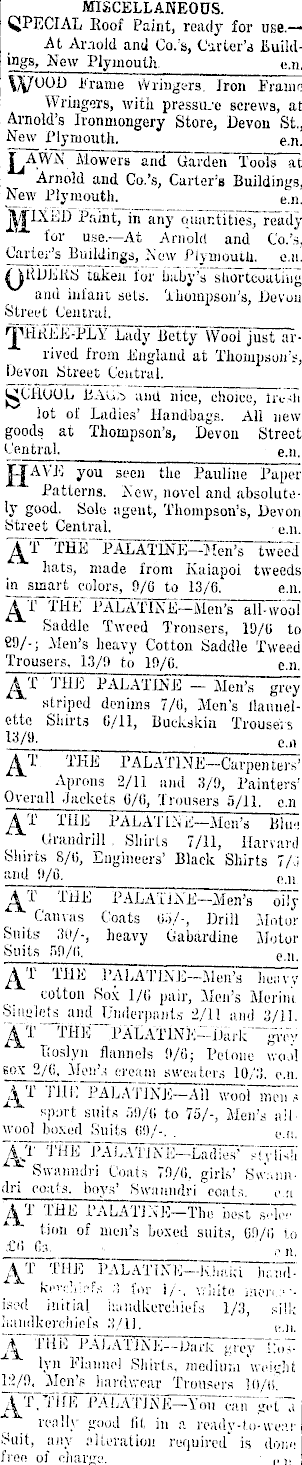 MISCELLANEOUS. SPECIAL Roof Paint, ready for use.- - At Ar.iold and Co.'s, drler'a liuildings, New Plymouth. e.n. Pranie Wringers, Iron Frame I Wringers, with pressure screws, at Arnold's Ironmongery Store, Devon St., New Plymouth. e.n. I AWN Mowers and G; Arnold and Co.'s, Cai ul-j. b x>uuuiugs, New Plymouth. e.n. JjjTIXKD Paint, in any quarTtities7ready for use.—At Arnold and Co.'s, Cartels Buildings, New Plymouth, e.n. QIQJjiKS taken for baby's TtTortcoaTing and infant sets, Thompson's, Devon Street Central. rived from England at Thompson's, iJevon Street Central. jcTIUOL i!AC?sTimfnic lot of Ladies' Handbags. All new goods at Thompson's, Devon Street Central. o>, AVE you seen the Pauline Paper Patterns. Now, novel and absolutely good. Sole agent, Thompson's, Devon Street Central. e.n. hats, made from Kaiapoi tweeds colors, 0/G to 13/6. e.n. THE all-wool Saddle Tweed Trousers, 10/ li to 29/-; .Men's heavy Cotton Saddle Tweed Trousers, 13/0 to 10/6. en J THE PALATINE-Carpenters' ii A ]' rt l ns 2/U l "" 1 3/9, I>ainters '' n " '--'--'- "'" Trousers 5/11. e.n THE PALATLNE-Men's Bluo Urstndrill . Shirts 7/11, Harvard Shirts 8/15, Engineers' Black Shirts 7/J and 0/6\ ~ „