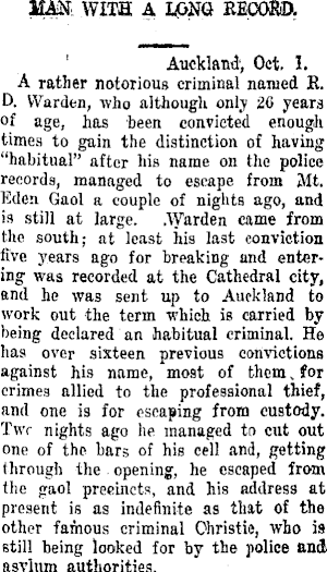 U WITH A i&m EEOOKa ' Auckland, Oct. 1. A rather notorious criminal named E. D. Warden, who although only 26 years of age, has been convicted enough times to gain the distinction of having "habitual" after his name on the police records, managed to escape from Mt. Eden Gaol a couple of nights ago, and is still at large. .Warden came from the south; at least his last conviction five years ago for breaking and entering was recorded at the Cathedral city, and he was sent up to Auckland to work out the term which is carried by being declared an habitual criminal. He has over sixteen previous convictions against his name, most of them„ for crimes allied to the professional thief, and one 19 for escaping from custody. Twr nights ago he managed to cut out one of the bars of his cell and, getting through the opening, he escaped from the gaol preeincts, and his address at present is as indefinite as that of the other famous criminal Christie, who is still being looked for by the police and asylum authorities.