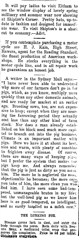 It will pay ladies to visit Eltham to see the window display of lovely spring millinery and summer wear now showing at Sliipton's Corner. Pretty hats, up-to-date in fashion and designed for immediate wear. To visit Shipton's is a short cut to economy.—Advt. If you contemplate purchasing a motor cycle see H. J. Kain, High Street, Hawera, agent for the Reading Standard, the finest production of American workshops. He stocks everything in the motor cycle line, and in all repair work ho guarantees an honest job. A WTiter in the Sydney Mail says:— "I have never been able to understand why more of our farmers don't go in for pigs, which, as you know, multiply more quickly than any other domestic animals, and are ready for market at an earlier age. Breeding sows, too, are not cxpensive to keep; except when they are Hearing the farrowing period they actually cost less than any other kind of farm stock.' Nor doe 3 a man already establislied on his block need much more capital to branch out into the pig business. Climate is an important matter with pigs. Here we have it at about its bes!, nice and warm, with plenty of sunshine to frighten ■ away disease. Of course, there are many ways of keeping jil.ys; but I prefer the system that makes tiie pigs keep me. And always iemeuilic;< that the pig is just as dirty as you nnut him. The more he is neglected the moi L objectionable he becomes; the more earn you take of him, the more clean you wut.j find him. I have seen some bad-tem-pered, unmanageable brutes in my life; but the well-bred pig as we know him here is as good-tempered, as intelligent, and as easily harried as a milch cow.'' THE LURKING FOB. Disease germs lurk in dust, ami enter tho body through the pores. Bath daily with Rexona Soap, a medicated toilet soap that- preserves the complexion. Pries Ift 6d per tablet. ObiMubl* awfwbot*.