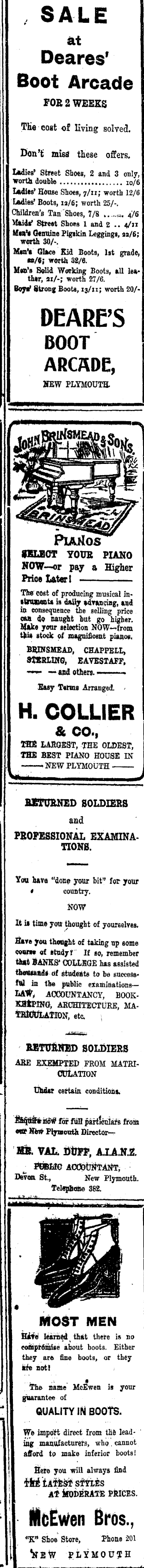 SALE at Deares' Boot Arcade FOE 2 WEEKS The cost of living solved. Don't misa these offers. Ladies' Street Shoes, 2 and 3 only, worti double io/6 Ladies' House Shoes, 7/11; worth 12/6 Ladies' Boots, ia/6; worth 25/-. Children's Tan Shoes, 7/8 4/6 Maids' Street Shoes 1 and 2 .. 4/11 ilml Genuine Pigskin Leggings, as/6; worth 30/-. Men's Glace Kid Boots, Ist grade, as/6; worth 32/6. Men's Bolid Working Boots, all leather, at/-; worth 27/6. Bojtf Strong Boots, 13/11; worth 20/DEARE'S BOOT ARCADE, HEW PLYMOUTH. r mm Pianos WUBOT YOUR PIANO HOW—or pay a Higher Price Later! The cost of producing musical in»toucan ts is dally advancing, and in consequence the selling price can 49 naught hut go higher. Make yonr selection NOW—from this stock of magnificent pianos. BRDTSMBAD, CHAPPELL, SfilHMire, EAVESTAFF, ~ and others. ■ » Easy Terms Arranged. H. COLLIER & CO., THE LABGEST, THE OLDEST, THE BEST PIANO HOUSE IN NEW PLYMOUTH RETURNED soldiers and PROFESSIONAL EXAMINATIONS. You have "done your bit" for your * country. NOW It is tine yow thought of yourselves. Have you thought of taking up some warn of study? If so, remember that HAKES' COLLEGE has assisted tfcwwtaadi df students to be successes in the public examinations— MW,, ACCOUNTANCY, BOOKKStPING, ARCHITECTURE, MATRttJULATION, etc. ; RBTTJRNBD SOLDIERS ABE EXEMPTED FROM MATRICOLATION Utader certain conditions. 1 from •W Hfctf Plymouth DirectorSB. VAL. tfiJW, A.U.N.Z. PGBMC ACCOUNTANT, Devon St., New Plymouth. Telephone 382. MOST MEN Hits leaned that there is no cotiipr6mise about boots. Either they are fine boots, or they We not! .i » The name McEwen is your guarantee of QUALITY IN BOOTS. We import direct from tH6 leading manufacturers, who. cannot afford to make inferior boots! Here you will always find ifc]££lTfci» sfYLES At ifIODERATE PRICES. McEwen Bros., «K" Shoe Store, Phone 201 VEW PLYMOUTH
