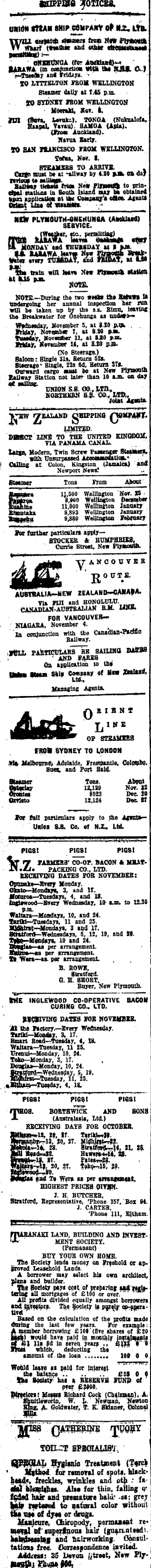 ■oppara notices. tMlftN tftAH nmi uflM* mmuittm MMfuttn W Wharf Mrtathk ahd «h*r rttWUMIUsil pntftik*).— " ONBttiKOA (f»r AWUttt)** ' Ituti (in nmiunetM* Mtft tht &S& (X ) --Tuesday >n< Fridays. ■ so LTTTBLTON PBOH WELLINGTON Steamer dally at T. 45 p.m. JKJ SYDNEY PBOM WELLINGTON - MoenJd, Xov. i |DI (Sott, Urate), TONOA (Nukualofa, Haapai, Vavau). SAMOA {Apia). UFroa Auckland). Navua Early. SO BAM FRANCISCO max Wellington. Tefue, No?. I. STEAMERS TO ARBIYE. , Caign must be at -allway by i.BO VJfc m daj 'tX iS'Mk New PlUMfe to prlnelpei stations in Booth Island au M obtained Wa applicatM at Uk Coaeuqr'a «a« Agent* UmSwmWb. • NEfc PLVMOUTIWIHSrtUNQA (AMUud) SERVICE. .ffir&niss. *. . DA*« $ " *%» tnln win lean Kw Rms«sk atatk® w*. NOTE —During the two weefcs the WMt I* Undergoing her annual Inspection her ittft will be taken op by the s.s. Blmu, learlng the Breakwater tor Onehunga as unde»>« Wednesday, November 5, at 8.20 p,qk . . fifciay, Norcnbtt 1, at B.M ml TMBT. November U, at IM MU VtUay, NevetaJier 14. at 8.80 p.m----(No Steerage.) Saloon: Single 31s, Semen 52a. Steerage* Single, 23s M, Betum ST*. Ourward cargo must be at New Plymouth Railway Station not later than It ajn. oa day U UNION S.S. 00., LTD., NOBHUSBN as. CO., W>„ r loUt Ag«ii*. jtew gfioppDia QeittAinr, lmtebd. DfItKCT LINE TO THE UNITED KDtGDOU, VIA PANAMA CANAL. Largs, Modem, Twin Screw FaMenMr Steaiaw*, nth Unsurpassed Aecoamodatlw.I at Colon, Kingston (JaauUca) Juw Newport News! v.- ■ ANCOUTEK 0 tf T E. NEW ZEALAND— CAHApA. Tla IDI and HONOLULU. __ CANADIAN-AUSTRALIAN B-M. liXB. FOR VANCOUVER—- ' NIAGAEA, November 4. In -iwrinwrtinn with the Cana'dlan-Padflc Hallway. ifßli PARTICULARS BE SAIUNfI IUSSS i . . k AND 94^*^ Oa application to tbf nwa shiv Company of Mm Ltd., Ufanagtng AgßlltS. 0 ItlHl L ike OP STKAMEB EROS BYDNEY TO U>NOON Jrf* Melboprnft Adelaide, Freeqtantle, Colombo, Sues, and Port SaidBteamer Tons. AbPQt sas? ■« rs Oztfeto 12.124 Dec. 21 for fnH particulars apply to the Agents—- ' Üblob &8. Co. of NX, Ltd. PIGSI PIGS! PIGS I %T 7 TAAMKB3' «M)P. BACON * IHATPI .Li. PACKING CO., LTD. RECEIVING DATES FOB NOVEMBER: Opmmke—Bray Monday. Okato—Monday*, 3, and IT. Motoroa—Tnesd*7B. 4. 18. btfawood— Brery Wednesday, 10- ajs, to 12.80 p.m. Waltara—Mondays, 10, and 24. SMkt-Toeadays, ll and 25. *5? 12!' 19, and 29. Tafcfr-Mffldiya, 10 and 84. B. BOWI, BtratTord. 6. H. SHORT, Buyer, New Plymouth. ME INGLEWOOD CO-OPERATIVE BACON CURING CO, LTD. JWOTOre DATEB SOB NOVWBIB. At lhe ractory.—Every Wednesday. Tarlkl—Moo4ay, 3, 17. Smart Boad-rTuesday, 4, 18. Waltara—Tuesday, 11 25. Ur«iul—Monday, 10, 84. Ttto—Monday, 3, 17. , Donglu—Monday, 10, 24. "" " * h i». ■Tuesday, 11, 25. " y. 4, is. rjtHOi piesi pigsi piesi 9. BOBTHWICK AND 80NS (Aostralasla, Ltd.) BECEIVING DAYS EOB OCTOBER. IS, M, BT. TwUfcrW, >rli, *Q,27. *. JS. 81, 2& HawsriwHi. 88. }, 20, 2T [ |nd T» WP» as per wtHffMat. HIGHEST PRICBB OIYfH, J. H. BUTCHEB, Stratford, Representative, Thone 157, Box 94. I. CARTER, 'phone 111, EJtham. fnABANAEI LAND, BUILDING AND BTTXBTIJ. MENT SOCIETY. (Permanent) BUY YOUB OWN HOME. _ The Society lends qoney on freehold or approved Leasehold Lands. A borrower may select hi* own architect, Blaos and builder. Tfte Society pays coat of preparing aad tMl*terluc all mortgages at £IOO or over.""" All inodts divided equally amongst borrowers and Tfee fyf# i» «^|pnBased on the calculation of the profit* made during the last few years. For example: " member borrowing £loQ'(flve shares of £2O l WWld.ha™ paid ij montiily InstalmenU *J 111 ?d in seven years ~ 8\33, » « which, deducting the amount of. the loan lot 0 t Wolild Uaie aa pali) for interest _ the balsnce .". .. £B* 6 ( SoolsW has a BKBEBVE FUND of prer WW*}w«iy«WW Cock (ClUtaaM), A. wnttleworta, w. L. Newmao, Newton , A. Goldwater, 1. K. SUnner, Colonel |ps qMSSMNI TOEUT spaomm. IPSSAI) Ifylimio Tre»t»ejit • Ifftbsd far nmonl of spot*, fcteckbt|dt, freckles, wrinklea and oty •' fatm btapilfeis. Alsa for thin, falling <r &4ad hair and premature bald' -*i; grej |w lifiMßd to natural color without muivof dy«»or drag*. UuieOTe, Chiropody, permaupi re* BMf»l Bt gnprafnqoa haii (gu^rtnt«d\. and ItirwarMnf. tatiou free. tJowespondfinca inTiUd. Jridreu: 35 Imtob utreat, New Ylj- . tUB&i VkiM tH, i