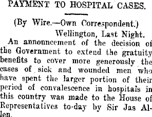 PAYMENT TO HOSPITAL CASES. (By Wire.—Own Correspondent.) Wellington, Last Night. An announcement of the decision ofthe Government to extend the gratuity benefits to cover more generously the cases of siok and wounded men who have spent the larger portion of their period of convalescence in hospitals in this country was made to the House of Representatives to-day by Sir Jas Allen.