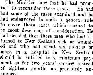 The Minister sai(» that he had promised to reconsider these cases. He had had some of the cases examined and he had endeavored to make a general rule to cover those cases which seemed to be most deserving of consideration. He had decided that those men who had returned to New Zealand sick or wounded and who had spent six months or more in a hospital in New Zealand should be entitled to a minimum payment as for two years' service, instead of eighteen months as previously announced.