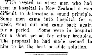 With regard to other men who had been in hospital in New Zealand it was difficult to determine a sound principle. Some men came into hospital for a week, went out and came back again for a period. Some were in hospital for a short period for minor ♦roubles. The proposal he had made seemed to him to be the best possible solution.