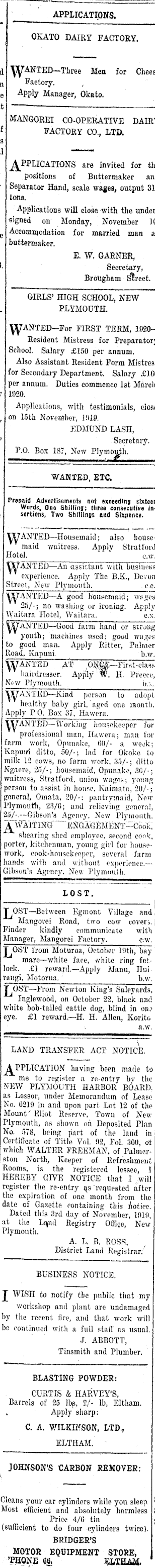 APPLICATIONS. OKATO DAIRY FACTORY. ANTED—Three Men for Cheesi Factory. Apply Manager, Oka to. MANGOREI CO-OPERATIVE DAHU FACTORY CO., LTD. APPLICATIONS are invited for tin positions of Buttermaker anc Separator Hand, scale wages, output 31( tons. Applications will close with the under signed on Monday, November 10 Accommodation for married man ai buttermaker. E. W, GARNER, Secretary, Brougham street. GIRLS' HIGH SCHOOL, NEW PLYMOUTH. RANTED— For FIRST TERM, 1920Resident Mistress for Preparatory School. Salary £l5O per annum. Also Assistant Resident Form Mistress for Secondary Department. Salary .€l6O per annum. Duties commence Ist March, 1020. Applications, with testimonials, close on 15th November, 1!)19. EDMUND LASH, Secretary. WANTED, ETC. Prepaid Advertisements not exoeeding sixteen Wards, One Shilling; three consecutive insertions, Two Shillings and Sixpence. —Housemaid; also housemaid waitress. Apply Stratford Hotel. c.w. YX^AMTED —An assistant with business experience. Apply The 8.K., De.'on Street, New Plymouth. cc. O—A good housemaid; w<igcs 25/-; no washing or ironing. Apply Waitar.a Hotel, Waitara. e.x. ANTED—Good farm hand or Strang youth; machines used; good wages to good man. Apply Hitter, Palmer Road. ICapuni. h.w. RANTED AT ,ON|®-First-ela9s hairdresser. Apply W. 11. Preece, New Plymouth. —Kind person to adopt healthy baby girl, aged one month. Apply P 0. Box 37, Hawera. RANTED— W orkiiig housekeeper for professional man, Hawera; man for farm work, Opunake, 80/- a weok; Kapuiri ditto, 50/-; lad for Okoke to milk 12 cows, no farm work, 35/-; ditto Ngaere, 25/-; housemaid, Opunake, 3(1./-; waitress, Stratford, union wages; young person to assist in house, Kaimata, 20,/-; general, Omata, 20/-: pantrytnaid, New Plymoufh, 23/0; and relieving genera!, 25/-. —Gibson's Agency, New Plymouth. ENGAGEMENT— Cook, shearing shed employee, second conk, porter, kitehenman, young girl for housework, cook-housekeeper, several farm hands with and without experience.— Gibson's Agency, New Plymouth. LOST. j^OST—Between Egniont Village and Mangorei Road, two cow cover;. Finder kindly communicate with Manager, Mangorei Factory. e from Moturoa, October lilth, bay mare—white face, white ring fetlock. £1 reward.—Apply Mann, Hui-. rangi, Motorua. b.w J^OST —From Newton King's Saleyards, Inglewood, on October 22, black and white bob-tailed eattle dog, blind in one eye. £1 reward.—H. H. Allen, Koritc, a.w. LAND TRANSFER ACT NOTIck APPLICATION having been made to me to register a re-entry bv the NEW PLYMOUTH HARBOR BOARD, as Lessor, under Memorandum of Lease No. 0219 in and upon part Lot 12 of the Mount' Eliot Reserve, Town of New Plymouth, as shown on Deposited Plan No. 578, being part of the land in Certificate of Title Vol. 02, Fol. 300, ot which WALTER FREEMAN, of Palmerston North, Keeper of Refreshment Rooms, is the registered lessee, 1 HEREBY GIVE NOTICE that I .will register the re-entry i}s requested after the expiration of one month from the date of Gazette containing this Aotice. Dated this 3rd day of November, 1010, at the Registry Office, New Plymouth. A. L. B. ROSS, District Land Registrar; BUSINESS NOTICE. J WISH to notify the public that my workshop and plant are undamaged by the recent fire, and that work will be continued with a full staff as usual. ,1. ABBOTT, Tinsmith and Plumber. BLASTING POWDER: CURTIS & HARVEY'S, Barrels of 25 lbp, 2/- lb, Eltham. Apply sharp: C. A. WILKINSON, LTD., ELTHAM. JOHNSON'S CARBON REMOVER: Cleans your car cylinders while you sleep Most efficient and absolutely harmless Price 4/6 tin (sufficient to do four cylinders twice). BRIDGER'S MOTOR EQUIPMENT STORE, 'PHONE OS. IiLTHAid.