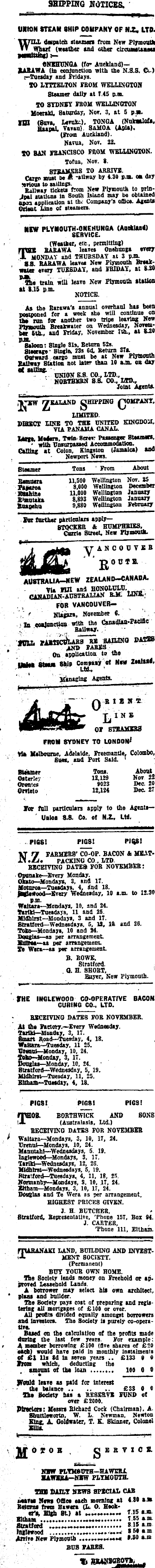 SHIPPING NOTICES. UNION STEAM SHIP COMPANY OF NX, LTD. despatch steamers from New Plymouth Wharf (weather tad other clrcuastanau 'wa eNRHUNGA (for Auckland)SARAWA (in conjunction with the N. 3.8. C<.) r-Tueaday and Fridays. TO LYTTELTON FROM WELLINGTON Steamer dally at T. 45 am. TO SYDNEY FROM WELLINGTON UderskL Saturday, Nor. 3, at G p.m. 101 (Sura, Lamb). TONGA (Nukualofa, n««P»i Vavau). SAMOA (Apia). (From Auckland). Nam, Not. 22. 10 UH FRANCISCO FROM WELLINGTON. Tofua, Not. 8. SXgAMEBS TO ARRIVS. Carpi auat be A -aUnay by 4.30 p.m. oa day revtoua to sailings. Railway tlcketa from New Plymouth to prlnJpal stations In South Island may be obtained Opxi application at thv Company'a office. Agents Orient Use of steamers. NEW PLYMOUTH-ONEHUNGA (AnokUnti SERVICE. (Weather, etc , permitting) piiuit BABAWA leaves Onehusga every 1 MONDAY and THURSDAY at 3 pJB. ' g.S. BABAWA leaTes New Plymouth Breakwater every TUESDAY, and IBIDAY, at 8.20 train Will leave New Plymouth »tattoo at 1.15 p.m. __ NOTICE. As the Barawa'a annual overhaul has been postponed for a week she will continue on the run for another two tripe leaving New Plymouth Breakwater on Wednesday, Novemlttr sth., and Friday, November 7th., at 8-20 pjtt. Saloon: Single 31s, Betorn 525. Steerage* Blngle, 23s 60. Return 37a. Outward cargo must be at New Plymouth Railway B(ation not later than 10 a.m. on day at mlMiw ' - . UNION S.S. CO., LTD., NOBTHXBN 8.8. CO., WD., joint Agent* l/EALAND gHIPPING OOMPANI, K LOOTED. DEECBCT LINE TO THE UNITED E3NGDOII. VIA PANAMA CANAL. Large, Modern. Twin. Botr Puienpt Steamers. * with Unsurpassed Accommodation. r.nin f at Colon, Kingston (Jamaica) and Newport News. y. ANCOUVEB 0 tt f B. R ' AUSTRALIA—NEW ZEALAND—CANADA. tin IDI and HONOLULU. _ CANADIAN-AUSTRALIAN R-M. LINK.; FOR VANCOUVER- ' 'f Niagara, November 6. In eonjuncttsn Canadian-Pacific #m.T. SAILING PASSS * iKS FABSS On application to the yyil stmt Ship Companir of New Zealaad, UdL* 4 3J*|tn|>lng AgBBtS. 0 BIS If t LIN S 0? STSAMHtS PROM SYDNEY TO LONDON* Vte Melbourne, Adelaide, Freeman tie, Colombo, Sues, and Port Said. ' ■Matter Tons. About oaterley 12,129 Not 22 Orontes >023 Dee. 20 Orrieto 12,124 Dee. 27 *or fall particulars apply to the Agents—- ' Uiloa BA. Co. of N.Z., Ltd. ■ PIGS! PIGS! PI®S! N.Z. FARMERS' CO-OP. BACON St MEAT- , . u . PACKING CO . LTD. BECETVTNQ DATES FOB NOVEMBEB: ■ Opunake—Every Monday. Okato—Mondays, 3, and 17. Moturoa—Tuesdays, 4. find 18. jatfleWood—livery Wednesday, 10 a.m. to 12.30 p.m. Waltara—Mondays, 10. and 24. YarlH—Tuesdays, 11 and 25. Mldhlrst—Mondays, 3 and 17. Stratford—Wednesdays. 5, 13, 1A and 26. Toko—Mondays, 10 and 24. "Tt 1 *. —as per arrangement. Httßoa—as per arrangement. ?e Wera—aa per arrangement. B. ROWE, Stratford- . O. H. SBOBT, Buyer, New Plymouth. VHE IN6LEWOOD CO-OPERATIVE BACON CURING CO.. LTD. BECEmNO DATEB FOB NOVEMBER. At the Factory.—Every Wednesday. Tarltt—Monday, 3, 17. Smart Road—Tuesday, 4, 18. Waltara—Tuesday. 11 25. Tftentd—Monday. 10. 24. Toko—Monday, 3, 17. Douglas—Monday. 10, 24. Stratford—Wednesday, 5, 19. Mldhlrst—Tuesday, 11, 25. BUhatt—Tuesday, 4, 18. - PIGS! PIGS! PIGS! niBOB. BORTHWICK AND SONS tA (Australasia, Ltd.) BECEIVING DATES FOR NOVEMBER Waltara—Mondays, 3, 10, 17, 24. Urenul—Mondays, 10, 24. Manutahl—Wednesdays, 5. 19. Inglewood—Mondays, 3, 17. Term—Wednesdays, 12, 26. Mldhlrst—Wednesdays, 5, 19. Stratford—Tuesdays, 4, 11, 18, 25. W«rmanby>—Mondays, 3. 10, 17, 24. EHham—Mondays, 3, 10, 17, 24. Douglas and Te Wera as per arrangement. HIGHEST PRICES GIVEN. J. H. BUTCHER, Stratford, Bepresentative, 'Phone 157, Box 94. J. CARTER, "Phone 111, Eltham. rnABANAKI LAND, BUILDING AND INVEBTiJL MBNT SOCIETY, (Permanent) BUY YOUB OWN HOME, lbs Society lends money on freehold or approved Leasehold Lands. A borrower may select his own architect, plus tad builder. The Society pays cost of preparing and registering all mortgages of £IOO or over. All profits divided e<iually amongst borrowers and investors. The Society is purely co-opera-tive. Based on the calculation of the profits made during the last few years. For example: A member borrowing £IOO (Ave shares of £2O •Mb) would have paid In monthly Instalments of £1 lis 3d In seven years .. £133 0 0 IMb which, deducting the tmount of tlw loan 100 0 0 • • Jfould leave as paid for interest the balance £3s 0 1 The Society has a RESERVE FUND of over £2OOO. JMneUm: Messrs Richard Cock (Chairman). A. S&utUewortn, W. L. Newman, Newton King, A Goldwattr, T. K. Skinner, Colonel XIIU. OjrO B . gEKVICS. NBW PLYMOUTH—HA WERA HAWEBA—NEW PLYMOUTH. <rme mtt.t news SPECIAL CAB jueaTee Hem OBce each mamlng at 4.M a * Returns from Hawsra (L. O. Hacker's, High 8t) at ............ 715 a.m. 81tham .......... 7.55 a m Stratford » l! a.m (niwwood «5J »m Arrive New Plymouth tM a.m BUS FABES. nbwammii....