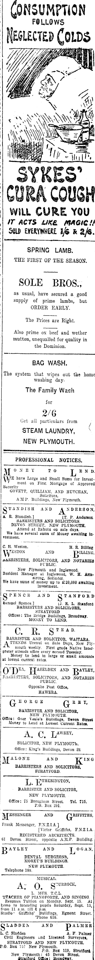 Consumption SELECTED (OLDS SYKES' QMk COUGH WILL CURE YOU tr ACTS £JK& MAGIC U SSU> EVERYWHERE ljs k 2/$. SPRING LAMB. THE FIRST OF TEE SEASON. SOLE BEOS., as usual, have secured a good supply of prime lambs, but ORDER EARLY. The Prices are Right. Also prime ox beef and wether mutton, unequalled for quality in the Dominion. BAG WASH. The system that wipes out the home washing day. The Family Wash for 2/6 Get all particulars from STEAM LAUNDRY, NEW PLYMOUTH. ( PROFESSIONAL NOTICES. jy~ONEY TO J^EN \/\7 E have Large ana Small Sums for Invest--1 nsent on First Mortgage of Approv prl Security GOVETT, QUILLIAM, AND HUTCHAN. Solicitors, A.MP. Buildings, New' Plymouth. gTAN DI 3 H AND NDEKSON, A R. Standish.] (.T. P. Anderson BARRISTERS AND SOLICITORS. DEVON STREET, NEW PLYMOUTH. Attend at Kahotu on sale days. We hue* suYeral aums of Money awaiting In* vestment. C. H. Weston. H. R. Billing * AND JJILLINB. BARRISTERS, SOLICITORS, AND NOTARIES PUBLIC. New Plymouth and Inglewood. Resident Manager at Inglewood, W. H. Armstrong, Solicitor. We have sums of money up to £20,000 awaiting investment. < gPENCE AND gTANFOKD Samuel Spence.] |J. R. L. SUtnford BARItISTEP.S AND SOLICUOBS, STRATFORD Offices: The Bridge Buildings, Broadwsy. MONEY TO LEND. C. R. S TEAD ' BARRISTER AND SOLICITOR, WAIT ABA. A TTENDS Urenui on Sale Days, New Plymouth weekly. First ffrade Native Interpreter attends office every aecoud Tuesday. Money to lend In large or small amount* at lowest current rales. O'J) 10 -'. JJASELDEN AND JgATLEY, RAriIiUTERS, SOLICITOUS, AND NOTARIES PUBLIC. Opposite Post Office, HAWEItA. Q.EORGE Q.RSY, BARRISTER AND SOLICITOR, NEW PLYMOUTH. Office: Over Ve&le's BulUliugs, Devon Street Money to Lend at Lowest Current Rates, A. C. LAWBEYSOLICITOR, NEW PLYMOUTh. Office: King's Buildings, Devon SI JJAIONE AND j£IN BARRISTERS AND SOLICITORS. STRATFORD. J^THERINGTON, BARRISTER AND SOLICITOR, NEW PLYMOUTH. Office: 75 Brougham Street. Tel. 715. P.O. Box 201. AND QRIFFITHS, Frank Messenger, F.N.Z.IA] [Victor Griffiths, F.N.Z I.A. REGISTERED ARCHITECTS. 01. Devon Street, opposite A.JI.P. Building. gAYLEY AND J^OGAN, DENTAL SURGEONS, MORBY'S BUILDINGS. NEW PLYMOUTH. Telephone 180. MUSICAL. A: O. S- URROCK ' L. MUS. T.C.L. TEACHER OP PIANOFORTE. AND SINGING. Resumes Tuition on Monday. Sept. 15. At homo to Intending pupils Saturday, Sept. 13, from 11 a.m. till 4 p.m. Studio ■ Griffith?' Buildings, Egmont Street. "Phono 616. gLADDEN AND pALMER L. C. Sladden A. F. Palme; Civil Engineers ;-nd Licensed Surveyor!, STRATFORD AND NEW PLYMOUTH. P.O. Box 110 New Plymouth. P.O. Box 119. StratfoM. New Plymouth: 45 Devon Street. Stratford Office BroadwuT.