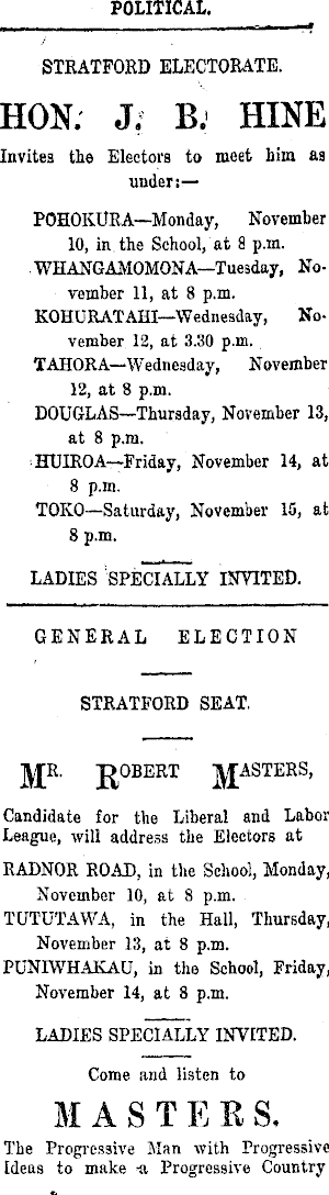 STRATFORD ELECTORATE. HON; J; B. HINE Invites the Electors to meet him as under:— POHOKURA—Monday, November 10, in the School, at a p.m. WHANGAMOMONA—TueBday, November 11, at 8 p.m. KOHURATAHI—Wednesday, November 12, at 3.30 p.m. TAHORA—Wednesday, November 12, at 8 p.m. DOUGLAS—Thursday, November 13, at 8 p.m. HUlßOA—Friday, November 14, at 8 p.m. TOKO—Saturday, November 15, at 8 p.m. LADIES SPECIALLY INVITED. GENERAL ELECTION STRATFORD SEAT. ROBERT RASTERS, Candidate for the Liberal and Labor League, will address the Electors at RADNOR ROAD, in the School, Monday, November 10, at 8 p.m. TUTUTAWA, in the Hall, Thursday, November 13, at 8 p.m. PUNIWHAKAU, in the School, Friday, November 14, at 8 p.m. LADIES SPECIALLY INVITED. Come and listen to MAST E R S, The Progressive Man with Progressive Ideas to make -a Progressive Country