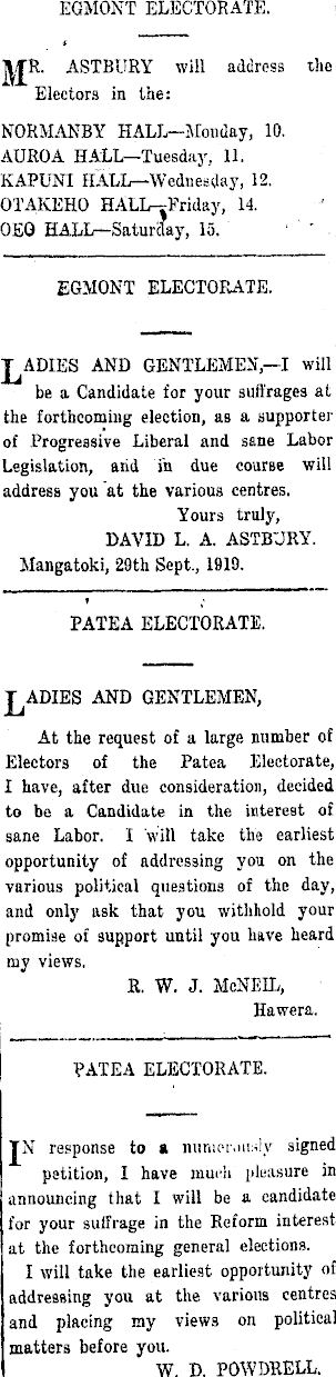 EGMONT ELECTORATE. TITR. ASTBURY will address the Electors in the: NORMANBY HALL—Monday, 10. AUROA HALL— Tuesday, 11. KAHJNI HALL—Wednesday, 12. OTAKEHO HALL-vFriday, 14. OEO HALL—Saturday, 10. EGMONT ELECTORATE. TADIES AND GENTLEMEN,—I will be a Candidate for your suffrages at the forthcoming election, as a supporter of Progressive Liberal and sane Labor Legislation, arid in. due course will address you at the various centres. Yours truly, DAVID L. A. ASTBURY. Mangatoki, 29th Sept., 1910. PATEA ELECTORATE. TADIES AND GENTLEMEN, At the request of a large number of Electors of the Patea Electorate, I have, after due consideration, decided to be a Candidate in the interest of sane Labor. I will take the earliest opportunity of addressing you on the various political questions of the day, and only ask that you withhold your promise of support until you have heard my views. R. W. J. McNEIL, Hawera. PATEA ELECTORATE. TN response to a nunior.msly signed petition, I have much pleasure in announcing that I will be a candidate for your suffrage in the Reform interest at the forthcoming general elections. I will take the earliest opportunity of addressing you at the various centres and placing my views on political matters before you. W. D. POWDRELL.
