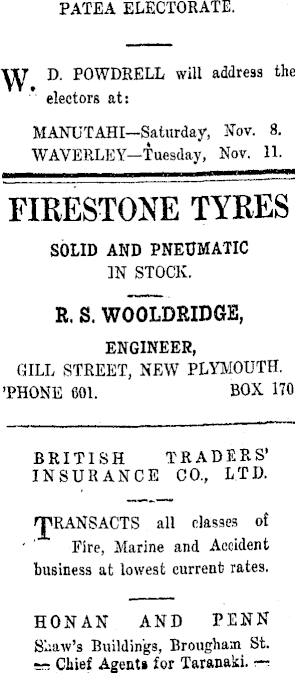 PATEA ELECTORATE. -J" D. POWDRELL will address the electors at: MANUTAHl—Saturday, Nov. 8. WAVERLEY—Tuesday, Nov. 11. FIRESTONE TYRES SOLID AND PNEUMATIC IN STOCK. R. S. WOOLDRIDGE, ENGINEER, GILL STREET, NEW PLYMOUTH. 'PHONE 601. BOX 170 BRITISH TRADERS' INSURANCE CO., LTD. all classes of Fire, Marine and Accident business at lowest current rates. HONAN AND PENN Sliaw's Buildings, Brougham St. 5=5 Chief Agent* for TaranaM. r~.