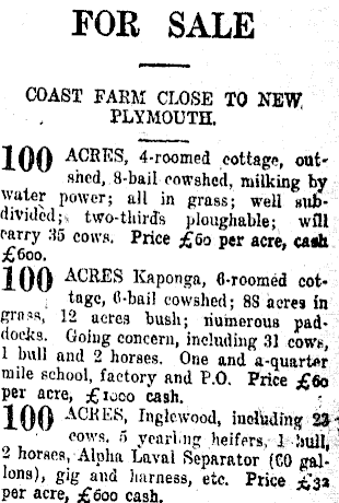 FOR SALE COAST FARM CLOSE TO NEW! PLYMOUTH. 100 ACRES « 4-roomed .cottage, outshed, 8-bail cowshed, milking by water power; ail in grass; well subdivided ji two-third's ploughable; will carry 35 cows. Price £6O per acre, caah £6OO. JQQ ACRES Kaponga, 8-roomed cot- : tagc, C-bail cowshed; 8S acres in gra?R, 12 acres bush; numerous paddocks. Going concern, including 31 cowe, 1 bull and 2 horses. One and a-quart*r mile school, factory and P.O. Price £6O per acre, £IOOO cash. 100 ACitEB ' Infikwood, including 2»i cows. 5 ycarlng heifers, 1 Ijull, 2 horses, Alpha Laval Separator (CO gallons), gig and harness, etc. Price £32 per acre, £6OO cash.