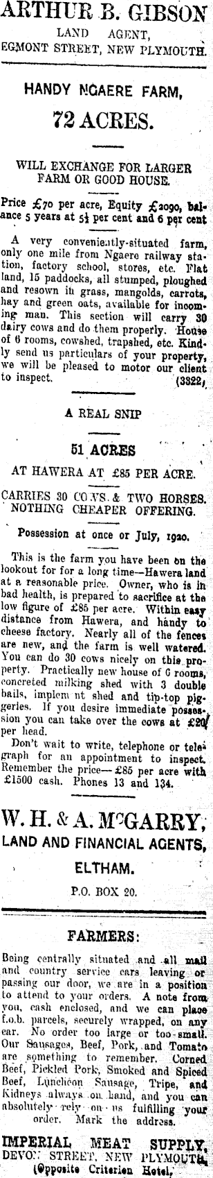 ARTHUR B. GIBSOtf LAND AGENT, EGMONT STREET, NEW PLYMOUTH. HANDY NGAERE FARM, 72 ACRES. WILL EXCHANGE FOR LARGER FARM OR GOOD HOUSE. Price £7O per acre, Equity £4090, foil* ance s years at si per cent and 6 per cent A very convenie;itly-situated farm, only one mile from Ngaero railway station, factory school, stores, etc. Flat land, 15 paddocks, all stumped, ploughed and resown in grass, mangolds, carrots, hay and greon oats, available for inooming- man. This section will carry SO dairy cows and do them properly. Hon» of H rooms, cowshed, trapshed, etc. Kindly send us particulars of your property, we will be pleased to motor our client to inspect. • (3328 l A REAL SNIP 51, ACRES AT HAWERA AT £BS PER ACRE.' CARRIES SO CO.VS.& TWO HORBEB. NOTHING CHEAPER OFFERING. Possession at once or July, loao. This is the farm you have been 6n the lookout for for a long time—Hawera land at a reasonable price. Owner, who is in bad health, is prepared to sacrifice at the low figure of £BS per acre. Within easy distance from Hawera, and handy to' cheese factory. Nearly all of the fence* are new, and the farm is well watered. You can do 30 cows nicely on thle.prq. perty. Practically new house of 0 room*, concreted milking shed with 3 double bails, implenvnt shed and tip-top piggeries. If you desire immediate potiw-. sion you can take over the cows at £&s per head. ' Don't wait to write, telephone or tela* graph for an appointment to inspect Remember the price—£Bs per acre with £ISOO cash. Phones 13 and 134. W.H.&A.M?GARRY; LAND AND FINANCIAL AGENTS, ELTHAM. r , FARMERS: . [Being centrally situated -and -«H mail and country service cars leavingJ.cf M passing our door, we are in a position! to attend to your orders. A note from you, cash enclosed, and we can place f.o.b. parcels, securely wrapped, on any ear. No order top large or too-small. Our Sausages, Beef, Pork, and Tomato 5 are something to remember. Ooraed : Beef, Pickled Pork, Smoked and Spies! Beef, Lynclicon Sausage, Tvipe, and Kidneys always on hand, and you can absolutely • rely on ■ ns f ulfUling your order. Mark the address, ::' IMPERIAL, MEAT SUPPLY i DEVO:; STREET. NEW PLYMQCTJ&i' lepsotlU CritMiwi H«UI/: J^i