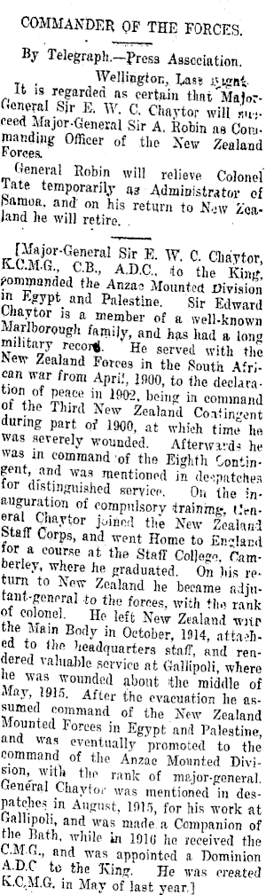 COMMANDER OF THE FORCES. By Telegraph.-Presa Association. Wellington, Las? tfignl H is regarded ns certain thai'Majorf.eneral S,r E. W. C. Chaytor will J.,, ceed Major-General Sir A. Robin as Con,mandmg Officer of the New Zealand r orces. General Robin will relieve Colonel late temporarily a 3 Administrator of Samoa, and on his return to N*w Zealand he will retire. . K-CM-G C.8., A.D.C.. to the King commanded ft. Amm M o„nt«t Divis > w' KflTrt and Palestine. Sir Edward & 13 a member »f a well-known Mar borough family, and has had a long mihtary recor*. He served with the ISew Zealand Forces in the South African war from April, 1900, to the declaration of peace in" 1902 beinp in command o the Third New Zealand Continent dunng part of 1900, at which time he was severely wounded. Aftenmd* he was m command : 0 f the Eighth Contingent and was mentioned in de-ipritcto for distinguished service. On the inauguration of compulsory train™, t.Vneral Qhaytor joined the New Zealand Staff Corps, and went Home to En-land tor a course at the Staff Coljego. Cam- *£?: W l cre he K radua «- On his return to New Zealand he became adju-tant-general to the forces, with the rank the Main Body m October, 1914, attach, ed to (he headquarters staff, and rendered valuable service at Gallipoli, where w wa , s n ,l voundft( l about the middle of May, 1915. After the evacuation he assumed command of the New Zealand Mounted Forces in Egypt and Palestine, and was eventually promoted to the command of the Anzac Mounted Division, with the rank 0 f major-general. General Chaytor was mentioned in despatches in August, 1015, for his work at ~ 'P o ' l ' and W£ > s made a Companion of PMn IThile ' m lm he 'reived the irir * flnd Was a PP omtpd »■ Dominion the Kin ff' He ,l ' as created K..C,M.G. in May of last year]