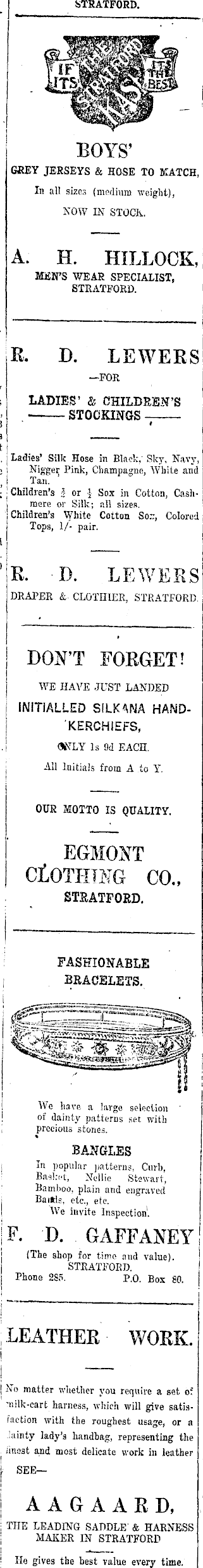 STRATFORD. IF JTS a£,3 BOYS' GKEY JERSEYS & HOSE TO MATCH, In all sizes (medium weight), NOW IN STOCK. A. H. HILLOCK, MiilN'S WEAR SPECIALIST, STRATFORD. . D. LEWEES —FOR LADIES' & CHILDREN'S ■ STOCKINGS 5. | Ladies' Silk Hose in Black,' Sky, Navy, e | Nigger Pink, Champagne, White and • t I Tan. Ij | Children's J or •} Sox in Cotton, Cashi mere or Silk; all sizes. Children's White Cotton So.-:, Colored Tops, 1/- pair. R. D. LEWEES DRAPER & CLOTHIER, STRATFORD. DON'T FORGET! WE HAVE JUST LANDED INITIALLED SILK ANA HANDKERCHIEFS, ONLY Is 9d EACH. Ail Initials from A to Y. OUR MOTTO IS QUALITY. EGMONT CtOTHTNG CO., STRATFORD. FASHIONABLE BRACELETS. MVS im»K We have a large selection of dainty patterns set with precious stones. BANGLES In popular patterns, Curb, Basket, Nellie Stewart, Bamboo, plain and engraved Baifcls, etc., etc. We invite Inspection'. F. D. GAFFANEY (The shop for time and value). STRATFORD. Phone 285. P.O. Box 80. LEATHER WORK. i |No matter whether you require a set of iiilk-cart harness, which will give satisfaction with the roughest usage, or a Jainty lady's handbag, representing the . iinsst and most delicate work in leather SEE—- | AAGA AR D, j THE LEADING SADDLE' & HARNESS I MAKER IN STRATFORD ' He gives the best value every time.