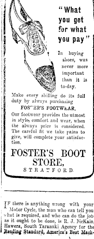 " What you get for what you pay" In buying shoes, was never more ■lipl Make every shillingduty by always purchasing FOSTER'S FOOTWtAR. Our footwear provides the utmost in comfort ami wear, when the always price is considered. The careful fit we take pains to give, will complete your satisfaction. important than it to-day. do its full FOSTER'S BOOT STORE, STRATFORDJ JF there is anything wrong with your i .Motor Cycle, the man who can tell you - u hat is required, and who can do the job | as it ought to be done, is R, J. JicKain, I Hawera, South Taranaki Agency for the • failing Standard, America's Best Ma eh-
