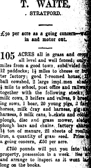T. WAITE, . STRATFORD. £SO per acre ai a going concent—f in and motor out. tAK ACRES all in grass and cr v all level and well fenced; «l miles from a good town, subdivided.! 12 paddocks; 1} miles to cheese or b ter factory; good 7-roomed houseU ball cowshed, 2 large impLmen at* J.mile to school, post office and railWl together with tbe following stocky milk cows, 3 heifers and calves, 9 bra ing sows, 1 boar, 20 young pigs, 2 U horses, milk dray and harness, glgn plough, disc and grass mower, ale plough bars and chain*.. factory «i)U 14 ton of manure, 22 sheets of no iron, a quantity of grass seed. Priew a going concern, £SO per acre. ■;'■ £750 pounds will put you into £ < property, possession in a week. Hee i and arrange to inspect as it wont If long on the books.