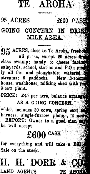 TE AROHJ^ 95 ACRES £6OO VA^ GOING CONCERN IN D MILKAXEA. <JS ACRES, dose to Te Aroh|, fretl all gi -g, except 20 acre* i class swamp; handy to cheeks'fac Bale>rrds, school, station and P. 0.; I . ly all flat and ploughable; watered, streams; 6 paddocks. New 3-ror" house, washhouse, milking shea with 3 cow plant. PRICE: £45 per acre, balance urtni " AS A GOING CONCESSIT' which includes 30 cows, spring cart harness, single-furrow plough, '2 l REPORT: Owner to a good man '_ he will accept £6O0 CASH for everything and will take a BUI Sale on the stock. H. H. DORR &£) LAND AGENTS TE AT"