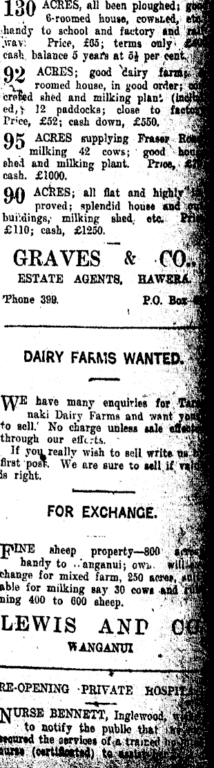 1 gA ACRES, all been ploughed! 6-roomed house, cownted, ihandy to school and factory and '.war. Price, £OS; terms only*. cash, balance 5 years at 5 J per cent.,; QO ACHES; good v dairy tu*& roomed house, in good order; 0 crolSed shed and milking plan'* (IneJ 1 ed,J ]2 paddocks; close to facte Trice, £52 j cash down, £550. ,*. QK ACRES supplying Fran* Rtf . milking 42 cows; ' good' hp< shed and milking plant Price, . £ cash. £IOOO. ' ;? OQ ACRES; all flat and proved; splendid house buildings,' milking shed etc. S$ £110; cash, £1250. ;■ ;. graves"* cdl* ESTATE AGENTS. HAWItIU." DAIRY FARMS WANTED. 1 have many enquiries for.' naki Dairy Farms and want' to sell.' No charge unless tale a through our effc.-ts. , If you really wish to Bell writ* w first posT. We are sure to sell if y» is right. ' .' FOR EXCHANGE. PINE sheep property—Boo . t handy to ..'anganui; owi.. wl change for mixed farm, 250 a«ra», v # able for milking say 30 cows and i ning 400 to 800 sheep. .'«' O LEWIS AND g WANGANOT '^ •OPENING PRIVATE BOSH URSE BENNETT, Inglewood,' to aotify the public thaV t,i