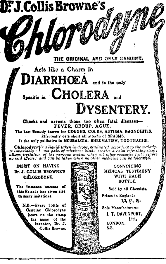 CJ.Collis Browne s vat THE ORIOINAL AWE OWLY GEMUSHE. Acts like a Charm in 5i Specific in and is the only Cheeks and arrests those too often fatal diseases— FEVER, CROUP, AGUE. T»« last «cm«lr known tor COUGHS, COLDS, ASTHMA, BRONCHITIS. Eftetnilljr <*!• ritort Ml attacks of SPASMS. '- •<■-. aaly P»Hi»tiT. la NEUKALCIA, RHEUMATISM, TOOTHACHE. allay —» bad efftcts IXfiKfsKlPSFfnSSSxSSsßßfand can be tatun when no other INSIST ON HAVING Dr. J. COLLIS BROWNE'S CdLOSOBYNE.
