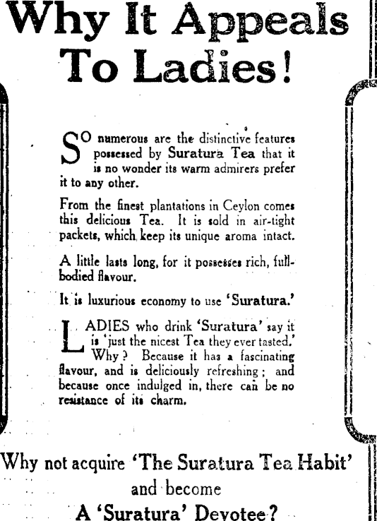 Why It Appeal To Ladies! SO numerous are the distinctive features possessed by Suratura Tea that it is no wonder its warm admirers prefer it to any other. From the finest plantations in Ceylon comes this delicious Tea. It is sold in air-tight packets, which, keep its unique aroma intact. A little lasts long, for it possesses rich, fullbodied flavour. It is luxurious economy to use 'Suratura.' LADIES who drink 'Suratura' say it is 'just the nice3t Tea they ever tasted.' Why ? Because it has a fascinating Savour, and is deliciously refreshing; and because once indulged in, there can be no resistance of its charm. Why not acquire 'The Suratura Tea Habit' and become A'Suratura' Devotee?