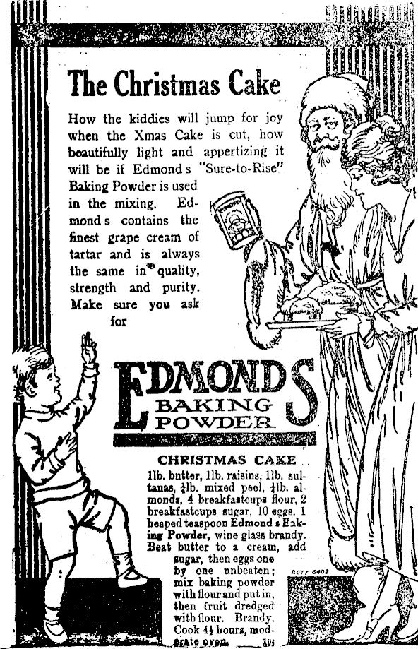 The Christmas Cake How the kiddies will jump for joy when the Xmas Cake is cut, how beautifully light and appertizing it will be if Edmonds "Sure-to-Rise" Baking Powder is used in the mixing, Edmonds contains the \/@WJ finest grape cream of tartar and is always the same inequality, . strength and purity. f^ Make sure you ask \|f ' for W< mmm 1 PCWDEBCHRISTMAS CAKE lib. butter, lib. raisins, lib. sultanas. Jib. mixed peel, ilb. albreakfastcups sugar, 10 eggs, 1 heaped teaspoon Edmond t Bakißf Powder, wine glass brandy. Seat butter to a cream, add sugar, then eggs one by one unbeaten; _c?-n mix baking powder withflourandputin, then fruit dredged with flour. Brandy. Cook 41 boan, modJM*t*_».Wß» , M