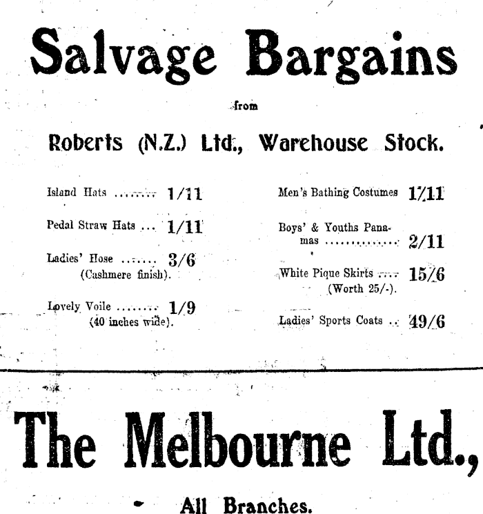 Salvage Bargains Roberts (N.Z.) Ltd;, Warehouse Stock. Island Hats ..■.-.-.-.-.--.- "|/11 Pedal Stravs Hats .... \/\\ Ladies' Hose ..;.... 3/g (Cashmere finish). : Lpvely Voile ......; (40 iaches wi3e). Men's Bathing Costumea 17H Boys' & Youths Panamas ..;..„.,;.:,...; %/\\ .White Pique Skirts .-.-.r 15/(J ; (Worth 25/-). .Ladies' Sports Coats .._• '49/6 All Branches.