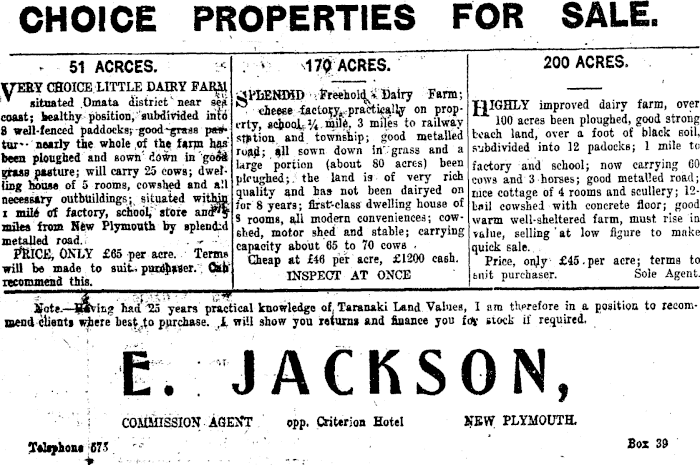CHOICE PROPERTIES FOR SALE. ► 51 ACRCES. i* . situated .Omnia district" near swift 170 ACRES. 200 ACRES. i-rty, schooLy* Me, 3 miles to railway 100 acres been piougnea, gooa swong —7- r------. »---»---- r --' st>ltion OT( i township; good metalled teach land, over a foot of black soil, m ?&.&L^J?£s-*&■!& Urge portion (about 80 acres) been factory and school; now carrying 60 j plrughed;. the land is of very rich cows and 3 horses; good metalled road; quality and has- not been dairyed on ,jj Ce co ttage of 4 rooms and scullery; 12h for 8 years; first-class dwelling house of cowshed with concrete floor; good ,i S rooms, all modern conveniences; cow- warm well-sheltered farm, must rise in i mil* of factory, school,' store an "ifcirnp mv *«s « a , , m * ■' t«™.' ca P»°ity »bo»t 65 to 70 cows . qu ick sale. ..' PTUCB, ONLY £65 per acre Term* q, £46 per £I2OO Cft6h . £45 . termg to SomSendlto PW ** ** ASPECT AT ONCE " .nit purchaser. Sole Agent. Mote.—ißviii« liad'^23i years practical knowledge oi.Taranaki Land Values, lam therefore in a position to recommend clients where" best,to purchase. ,t will show you returns and finance you fov stock if required, t. JACKSON, COHSnSSIOM AGENT opp. Criterion Hotel NEW PLYMOUTH. TaltphoM ;675.