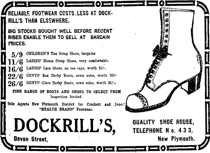 RELIABLE FOOTWEAR COSTS.LESS AT DOCKRILL'S THAN ELSEWHERE. BIG STOCKS BOUGHT WELL BEFORE RECENT RISES ENABLE THEM TO SELL AT BARGAIN PRICES. K/Q . CHILDREN'S Tan Strap Shoes, bargains 1 f/g LADIES' House Strap Shoes, very comfortable. 1 g/fi LADIES' Lace Shoes, no toe caps, worth 25/-. 22/6 GENTS' Box Derby Boots, sewn soles, worth 30A 26/6 GENTS ' GUice Deri, y Boot9 > sewn soles ' worth W'* MNE RANGE OP BOOTS AND SHOES TO SELECT FROM Inspection Invited. Sole Agents New Plymouth District for Crockett and Jones' "HEALTH BRAND" Footwear. DOCKRILL'S, QUALITY SHOE HOUSE, TELEPHONE No. 4 3 3, New Plymouth.
