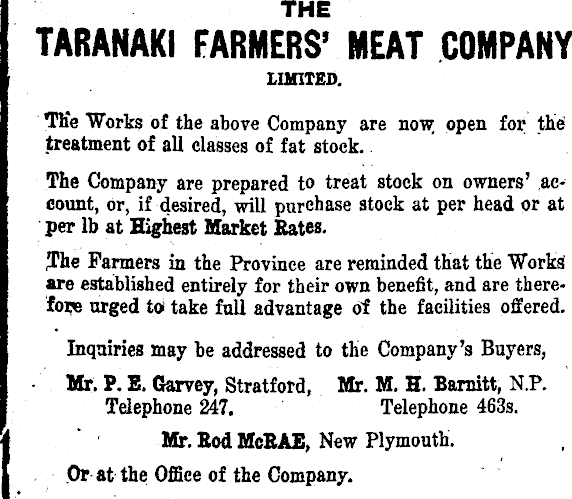 TARANAKI FARMERS' MEAT COMPANY TKe Works of the above Company are now, open for the 1 treatment of all classes of fat stock. The Company are prepared to treat stock on owners' account, or, if desired, will purchase stock at per head or at per lb at Highest Market Bates. The Farmers in the Province are reminded that the Works are established entirely for their own benefit, and are therefore urged to take full advantage of the facilities offered. Inquiries may be addressed to the Company's Buyers, Mr. P. E. Garvey, Stratford, Mr. M. H. Barnitt, N.P. Telephone 247. Telephone 4635. Mr. Sod McRAE, New Plymouth. Or at the Office of the Company.