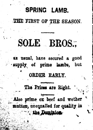 SPRING LAMB. THE FIBST OF THE SEASON. SOLE BROS., is usual, have secured a, good supply of prime lambs, but , ORDER EAKLY. The Pries* are Bight. \, " j Also prime ox beef and wether T I mntton, unequalled for quality in j
