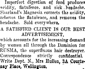 Imperfect digestion of food produces acidity, flatulence, and sick . headache. Slsarland'R Magnesia corrects tha acidity, relieves the flatulence, and removes tho headache. Sold everywhere. A SATISFIED CLIENT IS OUR BEST ADVERTISEMENT, which accounts for the increasing demand by women all through tho Dominion for RUSMA, the superfluous hair destroyer. Correspondence strictly confidential, Write Dept. N„ Mrs Hullen, 3A Courtsnay Plac», Wellington.