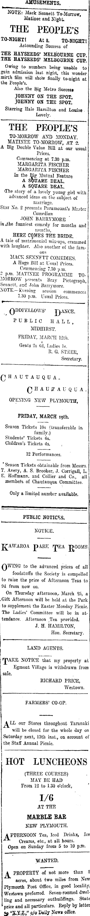 AMUSEMENTS, NOTE: Mack Sennett To-Morrow, Matinee and Night, THE PEOPLE'S TO-NIGHT! At 8. TO-NIGHTI Astounding Success of TEE HAYSEEDS' MELBOURNE CUP THE HAYSEEDS' MELBOURNE CUP, Owing to numbers being unaMe to gain admission last night, this wonder mirth film will show finally to-night at the People's. Also the Big Metro Success JOHNNY ON THE SPOT. JOHNNY ON THE SPOT. i Starring Hale Hamilton and Louisa Lovely. THE PEOPLE'S TO-MORROW AND MONDAY MATINEE TO-MORROW, AT 2. A Big Double Value Bill at our usual Prices. Commencing at 7.30 p.m. MARGARITA FISCHER MARGARITA FISCHER In the Big Mutual Feature A SQUARE DEAL. A SQUARE DEAL. <The story of a lovely young girl with " advanced ideas on the subject of marriage. Star No. 2 presents Paramount's Mwtcr Comedian JOHN BARRYMORE in»the funniest comedy for months and months, HERE COMES THE BRIDE. A tale of matrimonial mix-ups, crammed with laughter. Also another of the famous MACK SENNETT COMEDIES. A Huge Bill at Usual Prices. Commencing 7.30 p in. 2 p.m. MATINEE PROGRAMME TOMORROW presents Bray Pictograph, Sennett, and John Barrymore. -NOTE.—Evening session commences 7.30 p.m. Usual Prices. ODDFELLOWS' J)ANCE. PUBLIC HALL, MIDHIRST. FRIDAY. MARCH 12th. Gents 2s 6d, Ladies Is. R. G. STEEP QHAUffA U Q U A . OPENING NEW PLYMOUTH, FRIDAY, MARCH igth. Season Tickets 10s (transferable in, family.) Students' Tickets 6s. Children's Tickets 4s. 12 Performances. ' Season Tickets obtainable from Messrs. T. Avery, A. S. Brooker, J. Corrigall, L. E. Hoffmann, and Collier and Co., all members of Chautauqua Committee. Only a limited number available. PUBLIC NOTICES. to the advanced prices of all foodstuffs the Society is compelled to raise the price of Afternoon Teas to 9d from now on. On Thursday afternoon, March 25, a .Gift Afternoon will be held at the Park to supplement the Easter Monday Picnic. The Ladies' Committee will be in attendance. Afternoon Tea provided. J. H. HAMILTON, Hon. Secretary. LAND AGENTS. "JUKE NOTICE that my property at Egmont Village is withdrawn from . sale. RICHARD PRICE, Westown. FARMERS' CO-OP. A LL our Stores throughout Taranaki will be closed for the whole day on Saturday next, 13th inst., on account of the Staff Annual Picnic. HOT LUNCHEONS (THREE COURSES) MAY BE HAD From. 12 to 1.30 o'clock, MAEBLE BAB NEW PLYMOUTH. 4 FTERNOON Tea, Iced Drinkg, Ice , Creams, etc., at all hours. Open on Sunday from 5 to 10 p.m. I WANTED. j \ PROPERTY of not more than 5 acres, about two miles from New I Plymouth Post Office, in good locality, Westown preferred. Seven-roomed dwelling and necessary outbuildings. State price and all particulars. Reply by letter *g "X.Y.Z," c/o Daily New* office.