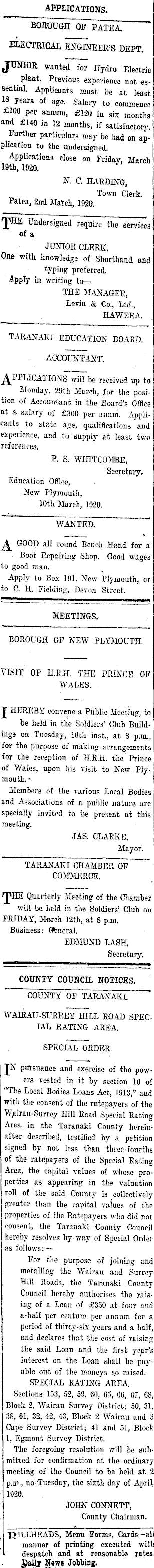 APPLICATIONS. BOROUGH OF PATEA. , ELECTRICAL ENGINEER'S DEPT, JUNIOR wanted for Hydro Electric plant. Previous experience not essential. Applicants must be at least 18 years of age.. Salary to commence £IOO per anmtmj £m in six mont)]s and £l4O in 12 months, if satisfactory, Further particulars may be had on application to the undersigned. Applications close on Friday. March 19th, 1920. N. C. HARDING, Town Clerk. Patea, 2nd Match, 1920. Undersigned require the services of a JUNIOR CLERK, One with knowledge of Shorthand and typing preferred. Apply In writing to— THE MANAGER, Levin & Co., Ltd., HAWERA. TARANAKI EDUCATION BOARD. ACCOUNTANT. APPLICATIONS will be received up to Monday, 29th March, for the position of Accountant in the Board's Office at a salary of £3OO per amini. Applicants to state age, qualifications and experience, and to supply at least two references. P. S. WHITCOMBE, Secretary. Education Office, New Plymouth, )oth March, 1920. GOOD all round Bench Hand for a Boot Repairing Shop. Good wages to good man. Apply to Box 191, New Plymouth, or to C. 11. Fielding, Devon Street. BOROUGH OF NEW PLYMOUTH. VISIT OF H.R.H. THE PRINCE OF WALES. •J HEREBY convene a Public Meeting, to be held in the Soldiers' Club Buildings on Tuesday, 16th hist., at 8 p.m., for the purpose of making arrangements for the reception of H.R.H. the Prince of Wales, upon his visit to New Plymouth. « Members of the various Local Bodies and Associations of a public nature are specially invited to be present at this meeting. JAS. CLARKE, Mayor. TARANAKICHAMBER OF COMMERCE. »pHE Quarterly Meeting of the Chamber will be held in the Soldiers' Club on FRIDAY, March 12th, at 8 p.m. Business: Gfcneral. EDMUND LASH, Secretary. COUNTY COUNCIL NOTICES. COUNTY OF TARANAKL WAIRAU-SURREY HILL ROAD SPECIAL RATING AREA. SPECIAL ORDER. TN pursuance and exercise of the powers vested in it by section 16 of "The Local Bodies Loans Act, 1913," and with the consent of the ratepayers of the Wairau-Surrey Hill Road Special Rating Area in the Taranaki County hereinafter described, testified by a petition signed by not less than three-fourths of the ratepayers of the Special Rating Area, the capital values of whose properties as appearing in the valuation roll of the said County is collectively greater than the capital values of the properties of the Ratepayers who did not consent, the Taranaki County Council hereby resolves by way of Special Order as follows: For the purpose of joining and metalling the Wairau and Surrey Hill Roads, the Taranaki County Council hereby authorises the raising of a Loan of £350 at four and a-half per centum per annum for a period of thirty-six years and a half, and declares that the cost of raising the said Loan and the first year's interest on the Loan shall be payable out of the moneys so raised. SPECIAL RATING AREA. Sections 153, 52, 59, 00, 65, 66, 67, 68, Block 2, Wairau Survey District; 50, 31, 38, 61, 32, 42, 43, Block 2 Wairau and 3 Cape Survey District; 41 and 51, Block 1, Egmont Survey District. The foregoing resolution will be submitted for confirmation at the ordinary meeting of the Council to be held at 2 p.m., no Tuesday, the sixth day of April, 1920. JOHN OONNETT, County Chairman. j TJILLHEADS, Menu Forms, Cards—all manner of printing executed with L despatch and at reasonable rates. Dailjr Newt Jobbing.